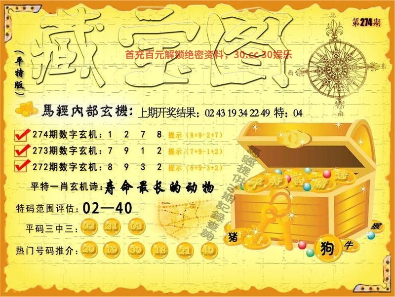274期:⑥肖 | 虎蛇狗龙兔鸡 | 开:狗44中 |